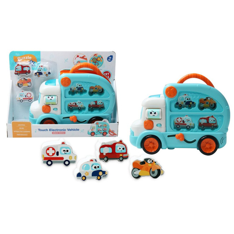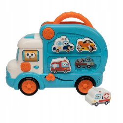 W zestawie 4 pojazdy, które dziecko może dopasować kształtem do odpowiednich otworów. Zabawka wspiera naukę kształtów, koordynacji ręka–oko i logicznego myślenia, usprawnia manualnie,