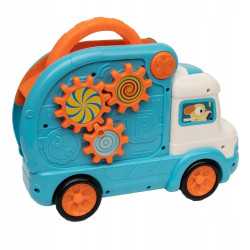Całość uzupełniają interaktywne elementy: przyciski uruchamiające silnik, klakson, rolkę z obrazkami oraz obrotowe zębatki.
