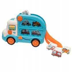 Po umieszczeniu auta w odpowiednim miejscu dziecko usłyszy radosne dźwięki i zobaczy błyskające światła. Dodatkową atrakcją jest zjeżdżalnia, po której auta mogą zjeżdżać.