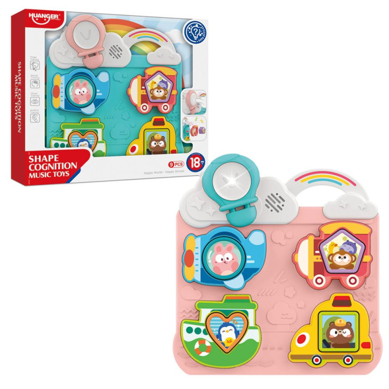 Muzyczny sorter kształtów – pojazdy 9 elementów, w tym 4 kształty pojazdów – statek, samolot, lokomotywa, auto 4 figury geometryczne – koło, serce, kwadrat, pięciokąt.