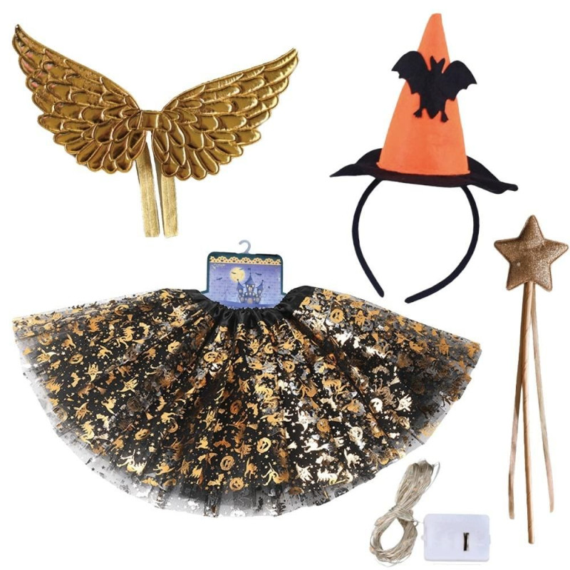 W zestawie tiulowa spódniczka (długość 30 cm), opaska - kapelusik, różdżka, skrzydełka, ledowe światełka.