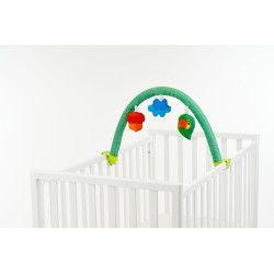 Mata ma 3 różne zastosowania jako mata edukacyjno-gimnastyczna z pałąkiem i zawieszkami, pałąk na łóżeczko/panel na łóżeczko, 3 miękkie zawieszki z materiału, w tym jedna grzechotka. Zabawki można odpiąć.