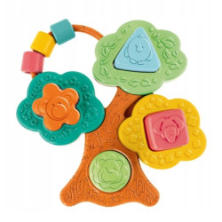 Dziecko będzie się dobrze bawić, czując i dotykając różne faktury drzewka oraz przedstawionych na kształtach postaci zwierząt, jak również przesuwając kolorowe koraliki, jednocześnie umieszczając kształty w odpowiednim otworze.