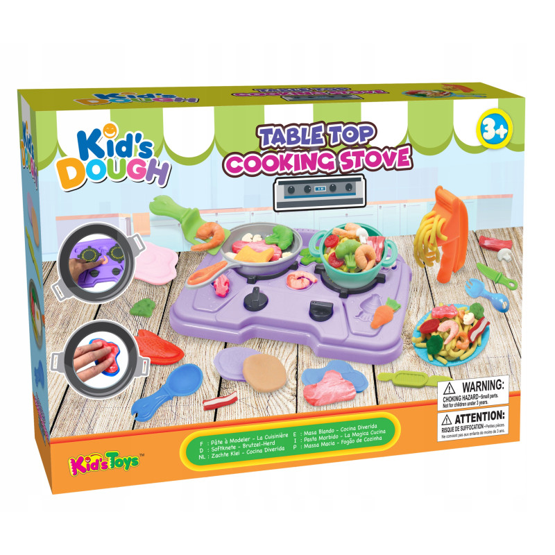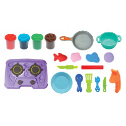 - formy i akcesoria do zabawy - garnek, nożyk, wałek, patelnia, talerzyk, 4 foremki, łopatka, sztućce..
