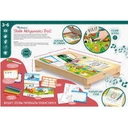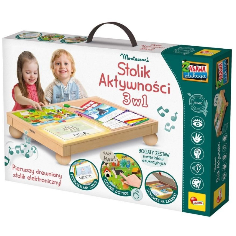 Wiele aktywności edukacyjnych, które pozwalają na rozwój wszystkich niezbędnych dla dziecka kompetencji. Stolik posiada podświetlenie, umożliwia rozwój sensoryki oraz posiada miejsce do przechowywania wszystkich elementów zestawu.
