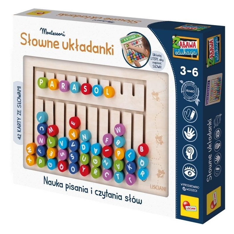 Drewniana tabliczka wzorowana na pedagogice Montessori z literami, która pozwala dziecku zaznajomić się z literami i literowaniem słów! Korzystając z liter w zestawie dziecko może rozpocząć swoją przygodę od prostych słów, by stopniowo tworzyć takie, które składają się z coraz większej liczby literek.