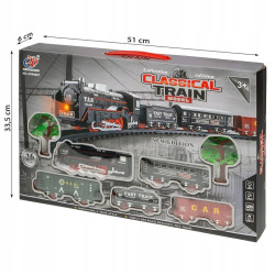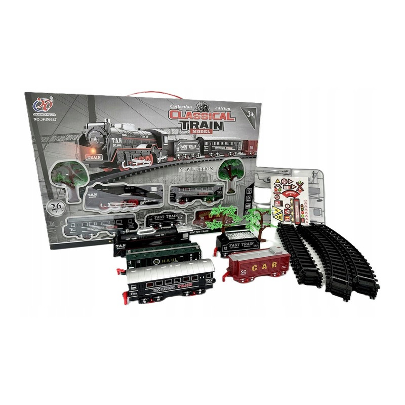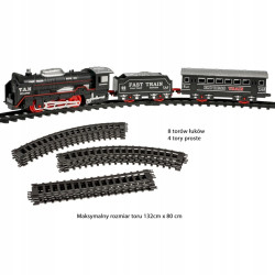 lokomotywa na baterie uruchamiana przełącznikiem/przyciskiem, – klasyczne zaczepy pozwalają łączyć skład (towarowe, pasażerskie – zależnie od partii graficznej), komplet torów – łuki + proste do złożenia pętli i wariantów torowiska, dodatkowe drobiazgi (w zależności od wersji): znaki, drzewka, stacyjka – budujesz swój mini-świat.