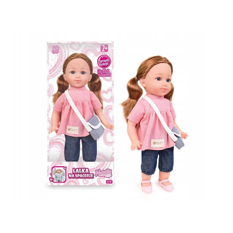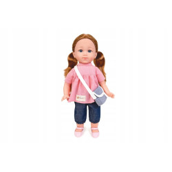 Piękna lalka, która ma 36 cm wysokości i zachwyca realistycznym wyglądem – duże niebieskie oczy, delikatny uśmiech i miękkie włosy w dwóch kitkach nadają jej wyjątkowego uroku. Ubrana jest w różową tunikę, ciemne spodnie oraz małą torebkę przewieszoną przez ramię, dzięki czemu wygląda jak gotowa na wyjście z domu.