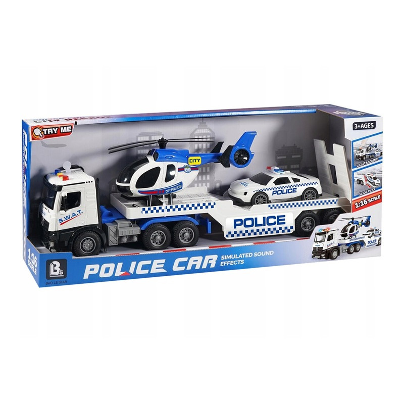 Laweta autko do zabawy posiadające napęd, dźwięki, świecące koguty oraz gumowe koła. Pojazd wykonany w całości z plastiku, z dbałością o najmniejsze szczegóły, posiada ruchome elementy. Dodatkową atrakcją są dwa pojazdy ratunkowe: helikopter i radiowóz. Po naciśnięciu na guziki na dachu lawety, światła migają i wydobywają się dźwięki.