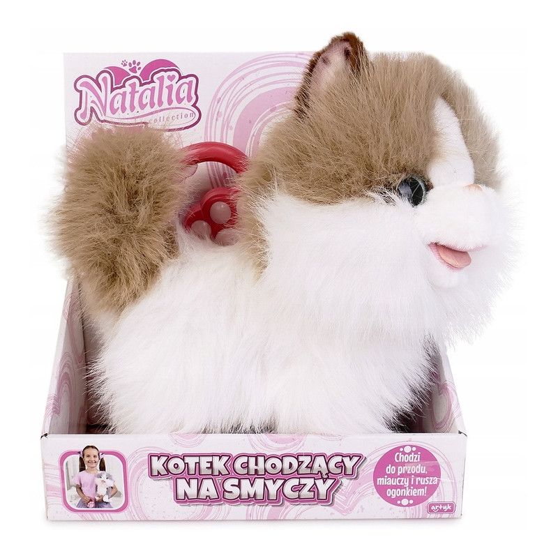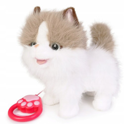 Interaktywny biało-rudy kotek, który chodzi, miauczy, merda ogonkiem i rusza główką.