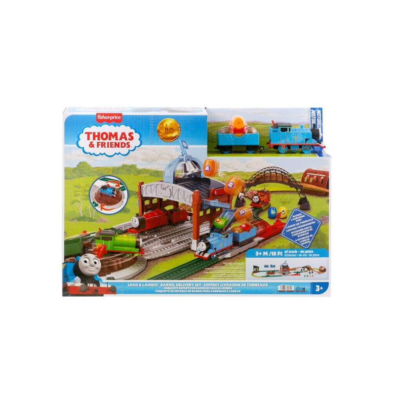 Świetna propozycja dla fanów Tomka i jego przyjaciół - wyjątkowy tor kolejowy „Dostawa beczek – załaduj i wystrzel”, który został przygotowany z okazji 80-lecia serii. Znajdziemy w nim klasycznego Tomka z napędem, wagonik z wyrzutnią oraz aż 5,5 metra torów i liczne elementy otoczenia, które pozwalają odtworzyć ulubione przygody z bajki. Podczas jazdy Tomek przejeżdża przez tunel i mostek, by dotrzeć do magazynu. Tam można załadować jedną z czterech kolorowych beczek i przewieźć ją na stację. Po dotarciu na miejsce ładunek automatycznie wylatuje na dach budynku, uruchamiając dzwonek. Dzięki obrotnicy lokomotywa zawraca i wyrusza po kolejną beczkę, zapewniając długie godziny pełne emocji.