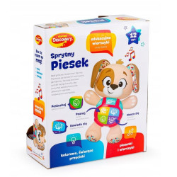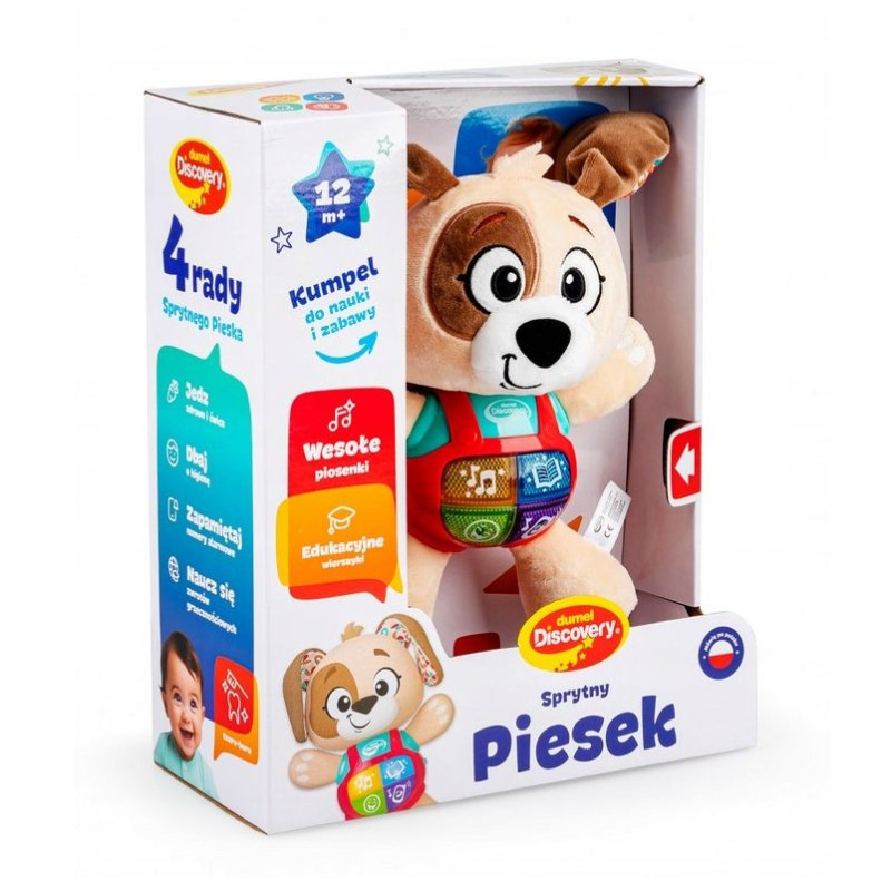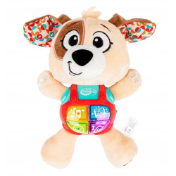 Fajna zabawka dla najmłodszych. Na brzuszku tego uroczego pieska znajdują się cztery przyciski, które po naciśnięciu świecą, odtwarzając przeróżne dźwięki. Zabawka łączy naukę z zabawą, gdyż edukacyjne treści i wierszyki, przeplatają się tu z wesołymi piosenkami (na temat zdrowego stylu życia, higieny, numerów alarmowych i zwrotów grzecznościowych).