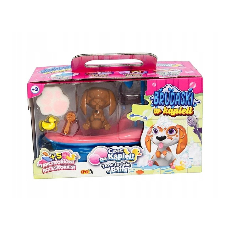 Każdego pieska można brudzić specjalnym błotkiem, a następnie umyć pod wodą, ciesząc się czystością i świeżością. Kąpiele z Brudaskami to prawdziwa frajda, zwłaszcza dzięki dołączonym aż pięciu akcesoriom, które urozmaicą każdą kąpiel.