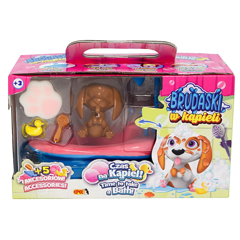Każdego pieska można brudzić specjalnym błotkiem, a następnie umyć pod wodą, ciesząc się czystością i świeżością. Kąpiele z Brudaskami to prawdziwa frajda, zwłaszcza dzięki dołączonym aż pięciu akcesoriom, które urozmaicą każdą kąpiel.