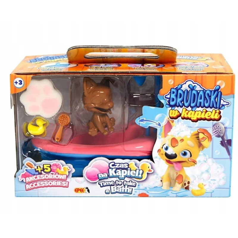 Każdego pieska można brudzić specjalnym błotkiem, a następnie umyć pod wodą, ciesząc się czystością i świeżością. Kąpiele z Brudaskami to prawdziwa frajda, zwłaszcza dzięki dołączonym aż pięciu akcesoriom, które urozmaicą każdą kąpiel.