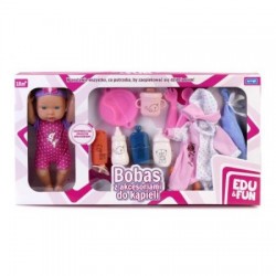 Lalka Bobas z akcesoriami do kąpieli. Zestaw zawiera: sztućce, miseczkę, 6 kosmetyków, 2 produkty spożywcze, gryzak, ręczniczek, ubranko na zmianę.