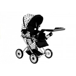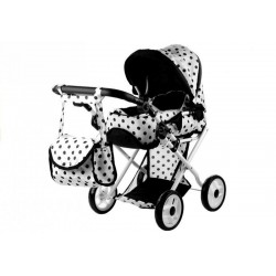 Wózek dla lalek Alice głęboki, nosidło, torba, pościel. Biały wózek w czarne groszki pięknie prezentuje się na spacerach. Idealny dla każdej małej dziewczynki.