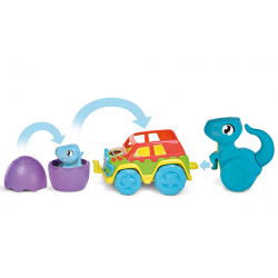W zestawie znajduje się kolorowe auto terenowe z dinusiem w fioletowej skorupce oraz jego mama.