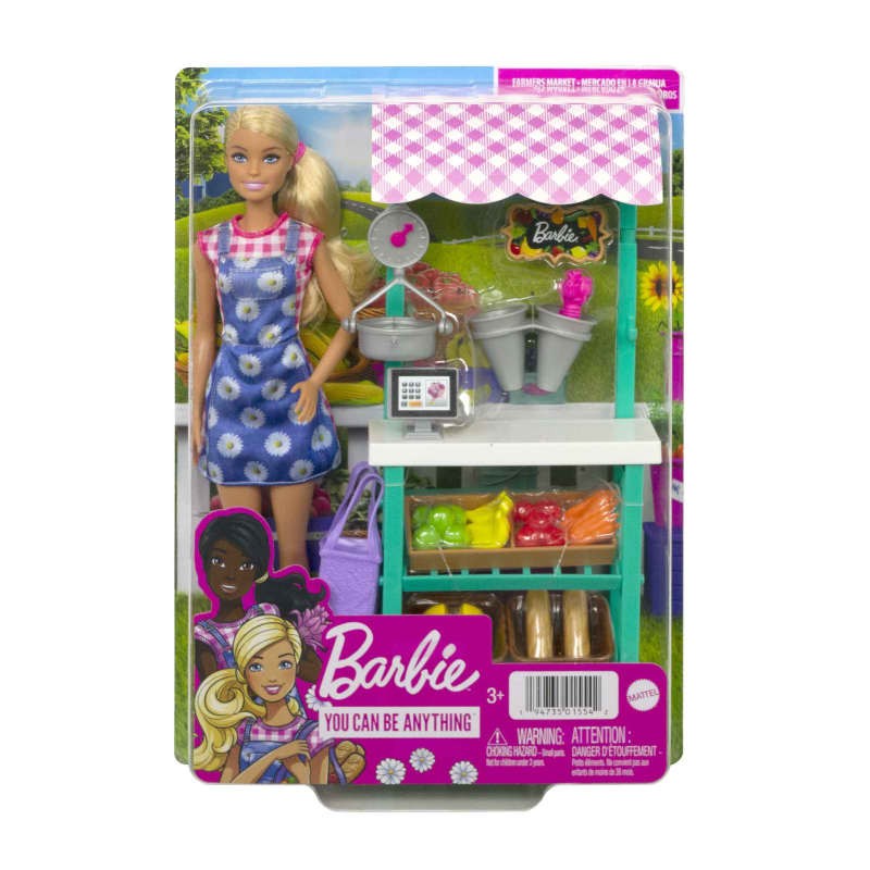 Spróbuj swoich sił jako właścicielka stoiska z produktami spożywczymi dzięki zestawowi do zabawy Barbie® Targ farmerski. Lalka Barbie® (blondynka, 29 cm) jest gotowa pomagać klientom, ubrana w uroczą kraciastą sukienkę z kwiecistym fartuchem i różowe wysokie buciki. Stoisko ma kraciasty baldachim oraz półki z dwoma koszykami na owoce, warzywa, ser i chleb. Jest tu też pojemnik, w którym można trzymać kwiaty na sprzedaż. Lalka Barbie® może zważyć produkty na wadze wskazującej ciężar, zapakować je do torby i „podliczyć” na kasie. Wśród akcesoriów są stoisko, „owoce”, „warzywa”, „ser”, „chleb”, „kwiaty”, torba na zakupy i kasa.