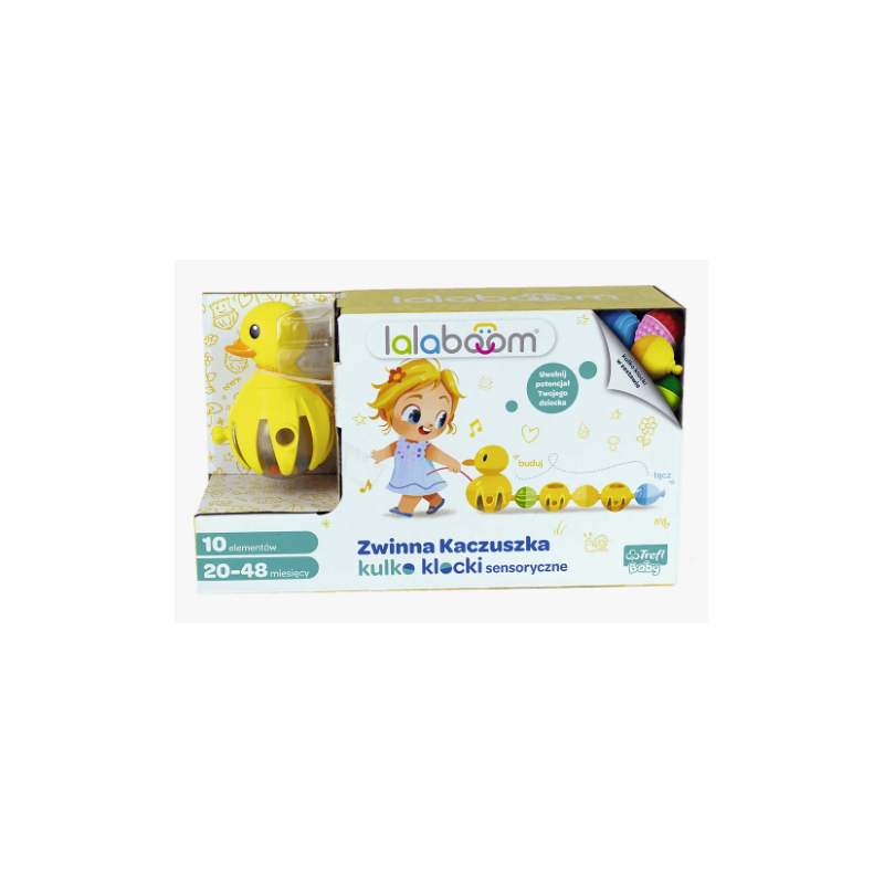 Zwinna Kaczuszka umożliwia łączenie różnych kulko-klocków, a także dowolny sposób składania elementów. Posiada sznureczek do ciągnięcia.