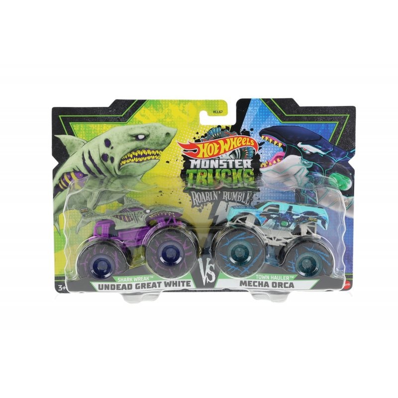 Organizuj epickie starcia z dwupakami Hot Wheels, z których każdy zawiera dwa odjazdowe samochody na wielkich kołach w skali 1:64.Zestaw pojazdów Hot Wheels Roarin' Rumble składa się z auta przypominającego złowrogą orkę Mecha Orca i auta podobnego do potężnego rekina Undead Great White.Każdy pojazd ma na karoserii potworny motyw, co sprawia, że zabawka wygląda na wyjątkowo groźną. Ogromne koła i metalowy korpus pomagają w robieniu kraks i demolki!Wyjątkowe kształty i kolory samochodów zwiększają przyjemność płynącą z kolekcjonowania Monster Trucków.Rozszerz swój zbiór o nowe pojazdy, aby doświadczać emocji i adrenaliny związanych z wyścigami i starciami.
