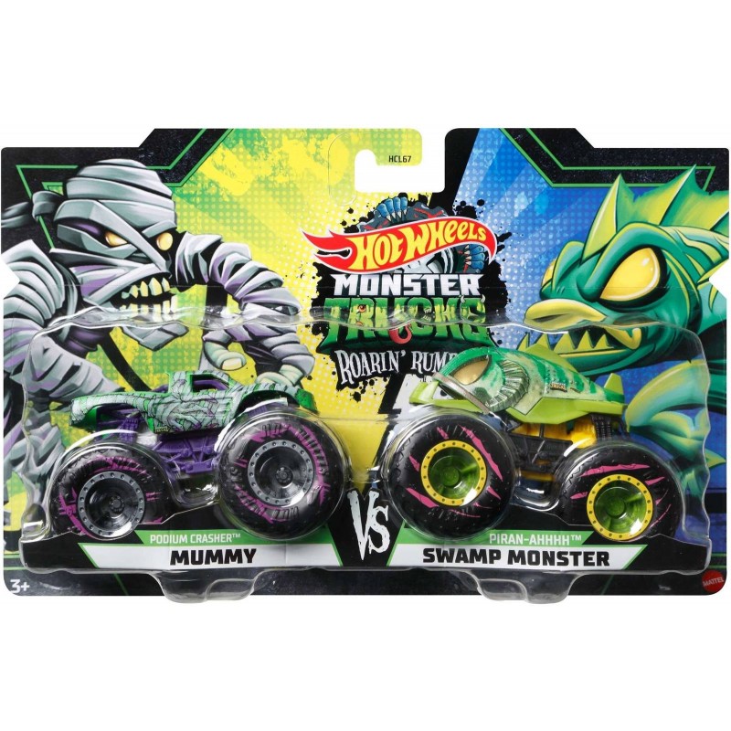 Organizuj epickie starcia z 2-pakami Hot Wheels® Monster Trucks Roarin’ Rumble™, z których każdy zawiera dwa pojazdy w skali 1:64, dzięki czemu możesz zacząć zabawę od razu po rozpakowaniu. Odkryj nowych i starych rywali: smok Mega Wrex™ kontra gryf Midwest Madness™, rekin Shark Wreak™ kontra orka Town Hauler™ czy potwór Town Hauler™ kontra wilkołak Hotweiler™. Dzięki Tobie te Monster Trucki są gotowe do starcia. Każdy pojazd ma inny potworny motyw, co wzbogaca kolekcjonerską zabawę. Zbierz je wszystkie i ruszaj do akcji w robienie kraks i demolki.