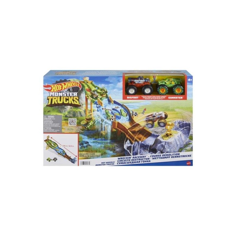 Przekonaj się, kto jest najszybszym i najbardziej nieustraszonym Monster Truckiem na arenie podczas rywalizacji w zestawie Hot Wheels® Monster Trucks Tor wyścigowy Turniej Tytanów. W tym zestawie zainspirowanym serią Hot Wheels® Turniej Tytanów w YouTube pojazdy Bigfoot™ i Gunkster™ robią totalną demolkę podczas zjazdu ze wzgórza. Przejeżdżają po „zgniecionych” autach i przez serię przeszkód, a w końcu przebijają się do jaskini, aby zdobyć upragniony Puchar Tytanów. Pierwszy pojazd, który przejedzie mostem, aktywuje „eksplozję” wyrzucającą rywala i spikera w powietrze. Zestaw składa się, ułatwiając przechowywanie i przenoszenie. Kolory i elementy dekoracyjne mogą się różnić. · Pędź w dół toru w zestawie Hot Wheels® Monster Trucks Tor wyścigowy Turniej Tytanów i wygraj Puchar Tytanów, aby móc pochwalić się swoimi umiejętnościami. · W zestawie są 2 pojazdy Hot Wheels® Monster Trucks – Bigfoot™ i Gunkster™ – aby od razu można było zacząć rywalizację. · Wypuść pojazdy równocześnie i kibicuj im podczas demolki: „zgniatania” aut, „rozbijania” blokady i unikania kłapiących paszczą krokodyli. · Pierwszy pojazd, który przebije się przez jaskinię, aktywuje „eksplozję” wysadzającą most i wyrzucającą w powietrze spikera i drugi pojazd. „Wybuch” odsłania też puchar! · Zestaw jest inspirowany wyścigami z serii „Hot Wheels Turniej Tytanów” w YouTube i będzie doskonałym prezentem dla dzieci od 4 roku życia.