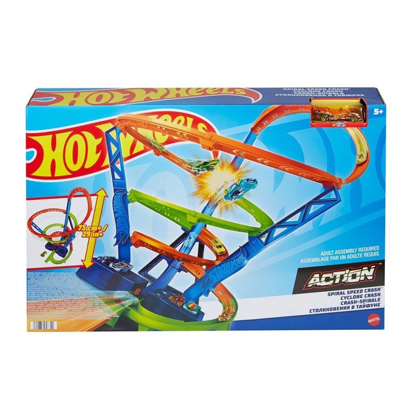 Zestaw Hot Wheels Wyścigowe Tornado dostarcza mnóstwa emocji podczas zabawy za sprawą toru o wysokości 73 cm, trzech stref kraks oraz przyspieszacza z napędem, który rozpędza samochodziki do zawrotnych prędkości. Przejedź przez przyspieszacz dołączonym do zestawu samochodzikiem Hot Wheels i obserwuj, jak mknie on po spiralnym torze. Aby zwiększyć poziom trudności, dodawaj kolejne samochodziki, aż w jednej ze stref dojdzie do nieuniknionej kraksy. Nad przedziałami na baterie oraz bramką są miejsca dla dodatkowych samochodzików. (Dodatkowe samochodziki sprzedawane oddzielnie). Kolory i elementy dekoracyjne mogą się różnić.
