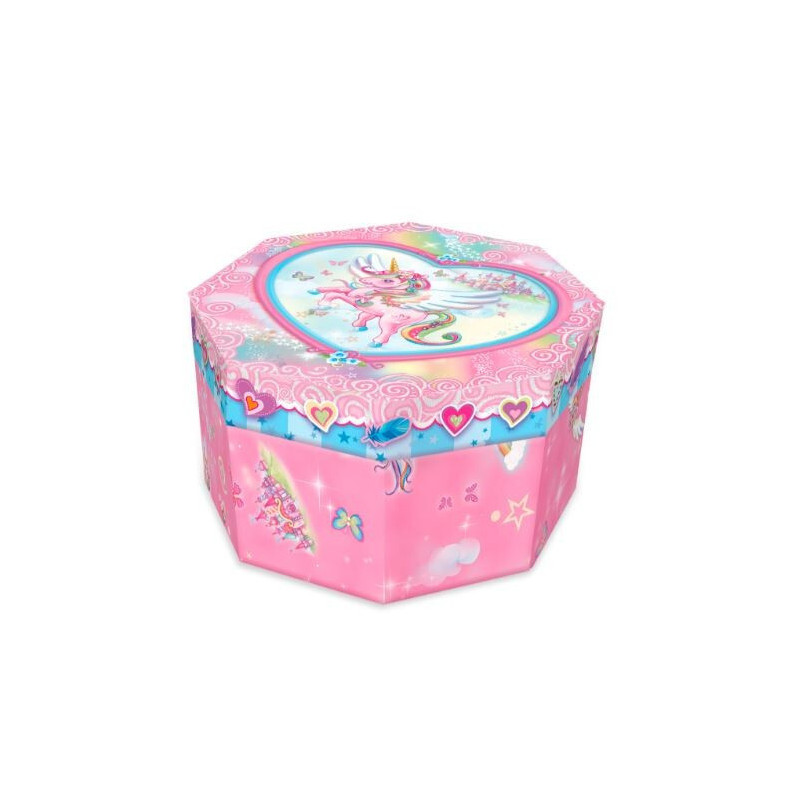 Przepiękna, nakręcana pozytywka przeznaczona dla dziewczynek. Pozytywka odznacza się ozdobnym motywem graficznym przedstawiającym JEDNOROŻCA. Udekorowana jest brokatem i błyszczącymi cekinami. Wewnątrz pozytywki znajduje się lusterko oraz miejsce na schowanie drobiazgów.