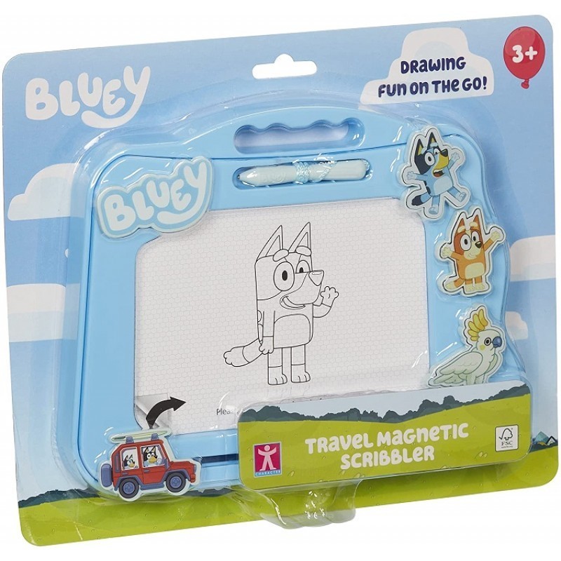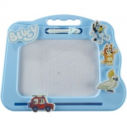Tablica rysunkowa Bluey pozwoli dzieciakom rysować ukochane postacie z bajki. Początkujący młody rysownik nie musi się martwić, że jeszcze nie do końca potrafi oddać kształt pieska. Pomogą mu stemple z wizerunkami Bluey, Bingo i papugi, które może obrysować! Niebieski znikopis jest lekki i poręczny - odpowiedni w podróży. Magnetyczny ołówek jest umieszczony na sznureczku, by dziecko nie mogło go zgubić.