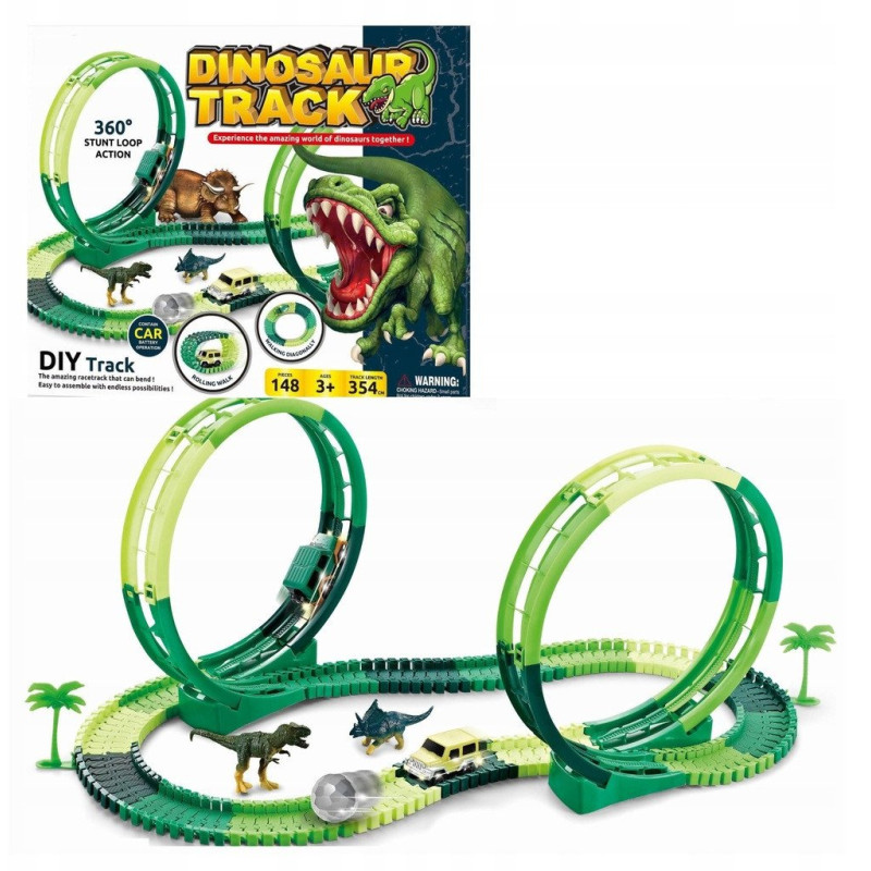 Motyw dinozaura sprawia, że tor staje się nie tylko miejscem wyścigów, ale także fantastycznym parkiem dinozaurów, który pobudza wyobraźnię najmłodszych. Dzieci mogą tworzyć różnorodne scenerie, co czyni zabawę jeszcze bardziej atrakcyjną. Zestaw składa się dużej ilości elementów co pozwala na elastyczne łączenie ich w różne konfiguracje. Dzięki temu dzieci mogą za każdym razem tworzyć nowe trasy, co zapewnia długotrwałą zabawę i rozwija ich kreatywność. Tor o długości 354 cm zapewnia mnóstwo miejsca na wyścigi i zabawę. Dzieci będą mogły cieszyć się długimi trasami, które można dowolnie modyfikować, co sprawia, że każda zabawa jest inna. W zestawie znajduje się autko na baterie, które dodaje dynamiki zabawie. Dzieci będą mogły obserwować, jak ich pojazd ściga się po stworzonym torze, co z pewnością dostarczy im wielu emocji. Figurki dinozaurów oraz palmy w zestawie dodają atrakcyjności i zachęcają do tworzenia własnych scenariuszy zabawy. Dzieci mogą wymyślać historie związane z dinozaurami, co rozwija ich kreatywność.