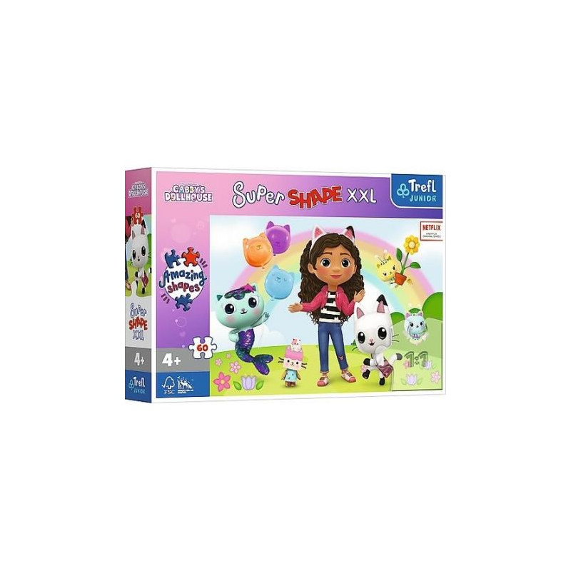 Weseli Przyjaciele Gabi to puzzle składające się z 60 bardzo dużych elementów, wśród których znajdują się również puzzle o nietypowych kształtach. Puzzle zostały stworzone z myślą o wszystkich fanach i fankach bajki Koci Domek Gabi. Po ułożeniu powstanie obrazek o wymiarach: 60x40cm Wymiary opakowania: 23x6x33cm