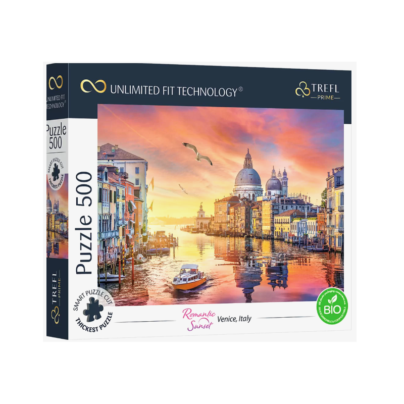 Puzzle UFT Venice, Italy to 500-elementowa układanka, która przedstawia romantyczny, skąpany w zachodzącym słońcu krajobraz włoskiego "miasta miłości". Po ułożeniu otrzymasz obraz o wymiarach 48 x 34 cm.