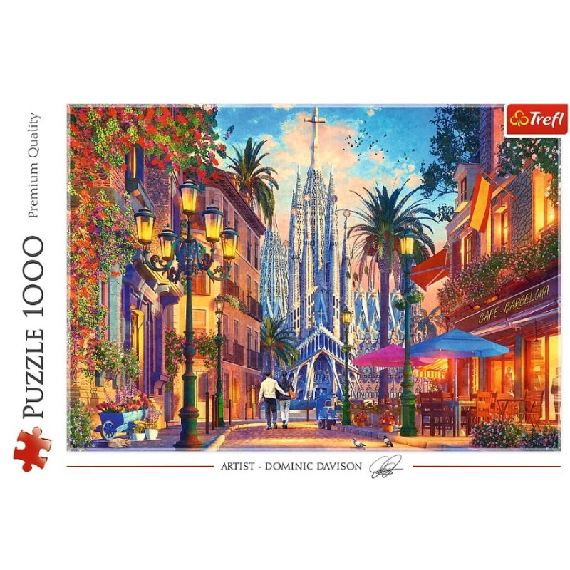 Puzzle 1000 elementów Barcelona, Hiszpania po ułożeniu stworzą obraz artysty Dominic Davison o wymiarach 68,3 x 48 cm. Ukazują hiszpańską uliczkę prowadzącą do znanej i imponującej bazyliki Sagrada Familia. Układanka została wyprodukowana w Polsce, z wysokiej jakości, ekologicznych materiałów. Zastosowanie specjalnego papieru kalandrowanego, który odbija światło, co ułatwia układanie.