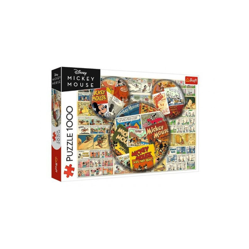 Puzzle Komiksowa Myszka Miki, składające się z 1000 elementów, przedstawiają retro kolaż z fragmentami komiksów Mickey Mouse. Po ich ułożeniu powstanie obrazek w rozmiarach 683x480 mm