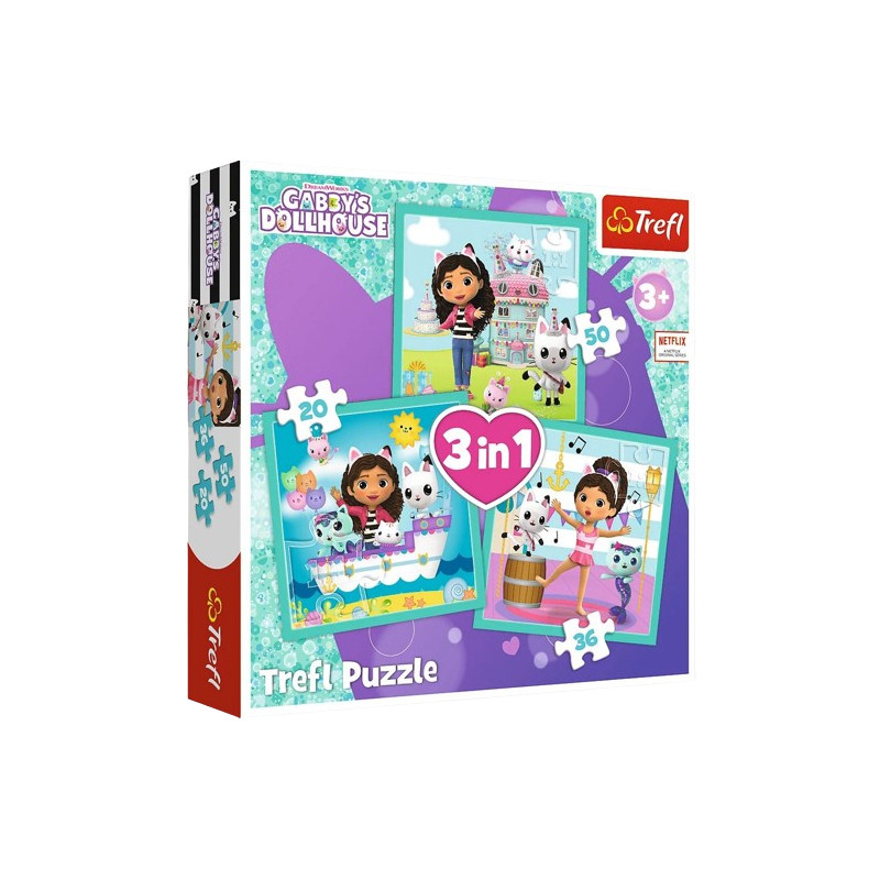 Układanki dla dzieci, zaprojektowane z myślą o małych fanach przygód bohaterów bajki Koci Domek Gabi. Po ułożeniu puzzli powstaną 3 różne obrazki - największy o wymiarach 20 x 19,5 cm. Zróżnicowana liczba elementów pozwala na zabawę zarówno młodszym, jak i nieco starszym dzieciom.