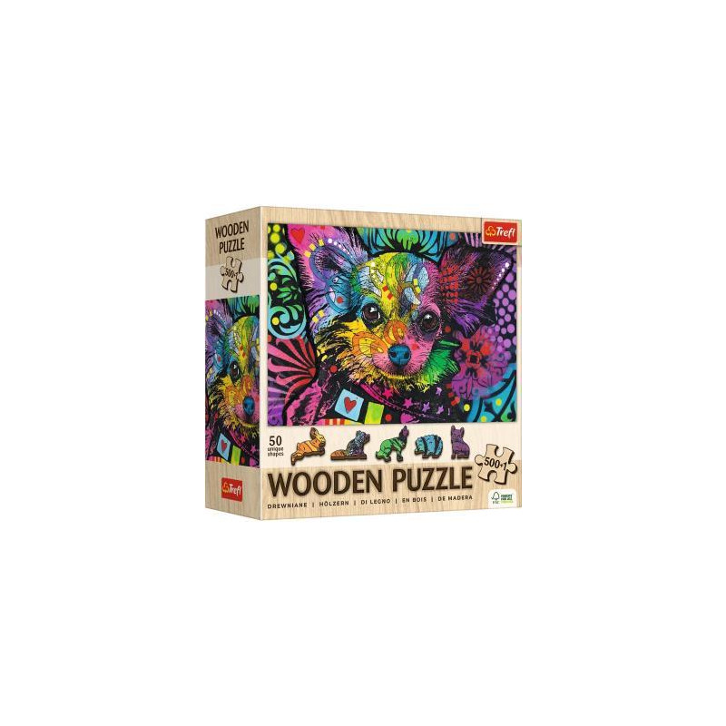 Seria puzzli jest idealna dla wszystkich miłośników układanek, pozwoli stworzyć obraz przedstawiający artystyczny portret psa. Układanka została wykonana z drewna, a opakowanie przyjazne środowisku w całości z tektury. Puzzle zawierają nieregularne elementy oraz 50 figurek.