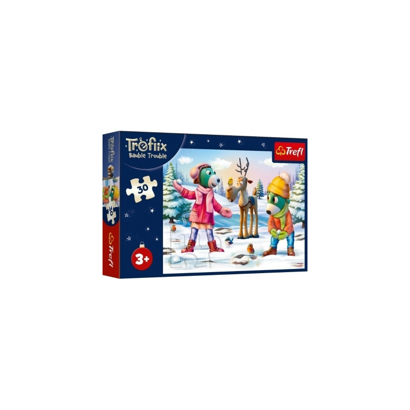Świąteczne puzzle, które składają się z 30 elementów, zaprojektowane z myślą o małych fanach bohaterów bajki Rodzina Treflików. Po ułożeniu układanki powstanie obrazek o wymiarach 270x200 mm. Produkt wykonano z wysokiej jakości materiałów, z zastosowaniem specjalnego kalandrowanego papieru, który odbija światło, co ułatwia układanie. Puzzle zostały wyprodukowane w Polsce, a do produkcji zostały użyte ekologiczne materiały.