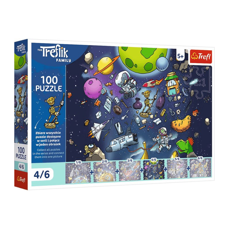 Kolorowa układanka dla dzieci inspirowana serią Rodzina Treflików. Puzzle po ułożeniu tworzą dynamiczną ilustrację przedstawiającą Robobota w kosmicznej scenerii. Obrazek jest pełen barw i detali, co sprawia, że układanie jest angażujące i rozwija spostrzegawczość dziecka. Produkt należy do większej kolekcji puzzli o tematyce kosmicznej – każdy zestaw przedstawia innego bohatera, a po zebraniu wszystkich można połączyć je w jedną dużą ilustrację z przygodami postaci. Elementy wykonane są z wysokiej jakości materiałów, dobrze do siebie pasują i są odporne na zniszczenia. Układanie puzzli wspiera rozwój zdolności manualnych, koncentracji oraz logicznego myślenia.