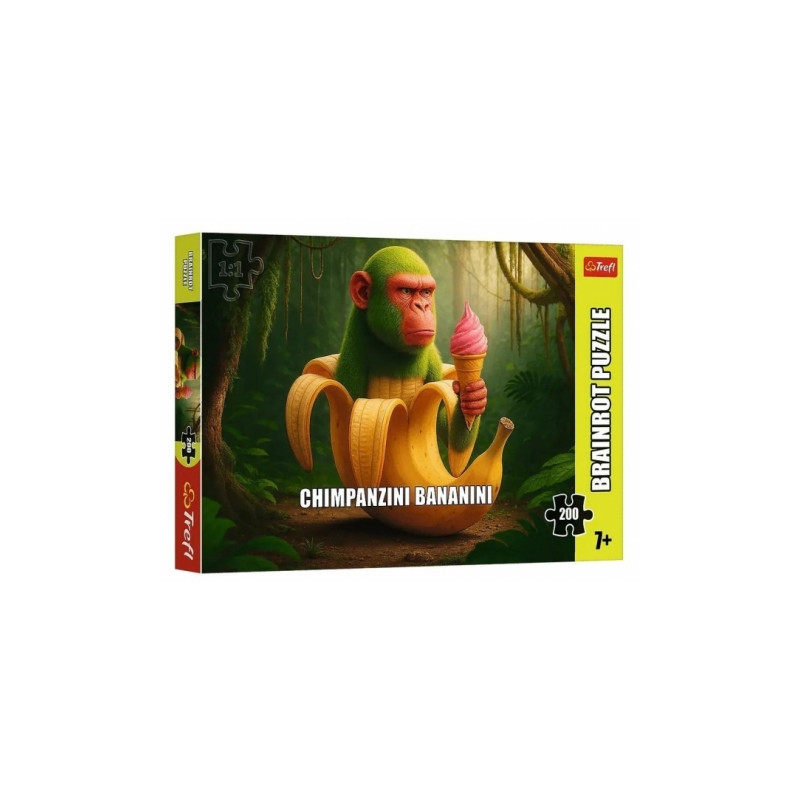 Puzzle przedstawiają humorystyczną, surrealistyczną scenę z serii BrainRots – charakterystyczną postać szympansa w nietypowej, zabawnej sytuacji (np. wychodzącego z banana). Grafika jest bardzo kolorowa i stylizowana, utrzymana w nowoczesnym, „memicznym” klimacie.