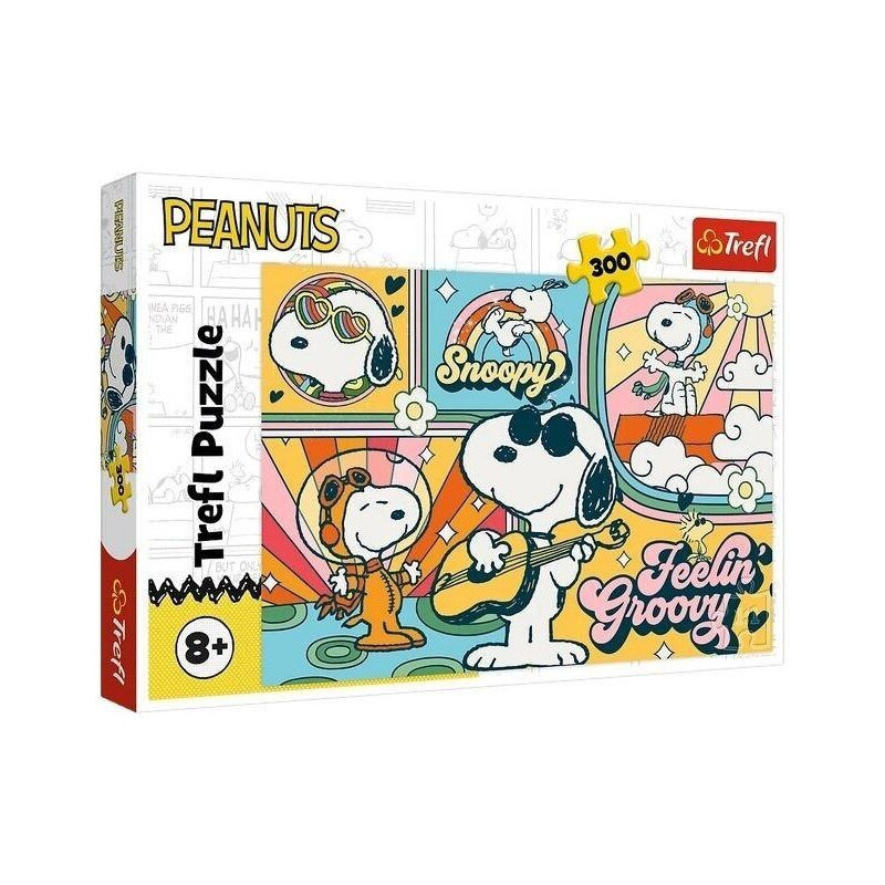 Puzzle firmy Trefl to układanka składająca się z 300 elementów, przedstawiająca kolorową, retro-stylizowaną scenę z bohaterami komiksu Fistaszki, w tym postacią Snoopy’ego ukazaną w kilku humorystycznych sytuacjach. Duża liczba szczegółów sprawia, że układanie jest angażujące i rozwija spostrzegawczość oraz koncentrację. Elementy wykonane są z wysokiej jakości tektury z kalandrowanym papierem odbijającym światło, co ułatwia dopasowywanie. Produkt przeznaczony jest dla dzieci od około 8 lat oraz dla osób preferujących średni poziom trudności.