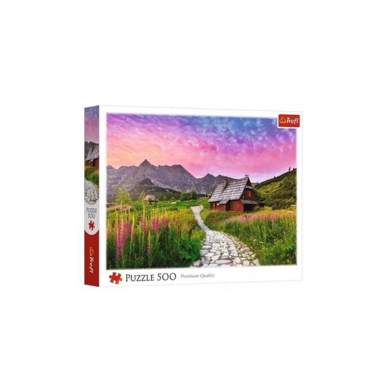 Puzzle przedstawiające malowniczą górską dolinę z tradycyjną drewnianą chatą, otoczoną kwitnącą roślinnością i majestatycznymi szczytami Tatr na tle barwnego nieba o zachodzie słońca. Wysoką jakość, nasycenie kolorów i bezpieczeństwo układania zapewnia kalandrowany papier odbijający światło, pokryty ekologicznymi farbami spożywczymi.