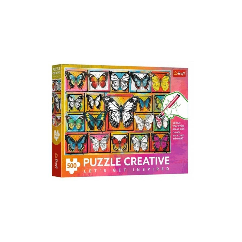 Układanka składająca się z 500 elementów, przedstawiająca różnorodne gatunki motyli w naturalnym otoczeniu, na tle kolorowych kwiatów i liści. Ilustracja jest pełna detali i intensywnych barw, co sprawia, że układanie jest zarówno relaksujące, jak i atrakcyjne wizualnie. Elementy wykonane są z wysokiej jakości tektury z powłoką odbijającą światło, co ułatwia dopasowywanie. Puzzle przeznaczone są dla dzieci od około 10 lat oraz dorosłych, oferując średni poziom trudności. Układanie wspiera rozwój koncentracji, spostrzegawczości oraz cierpliwości.