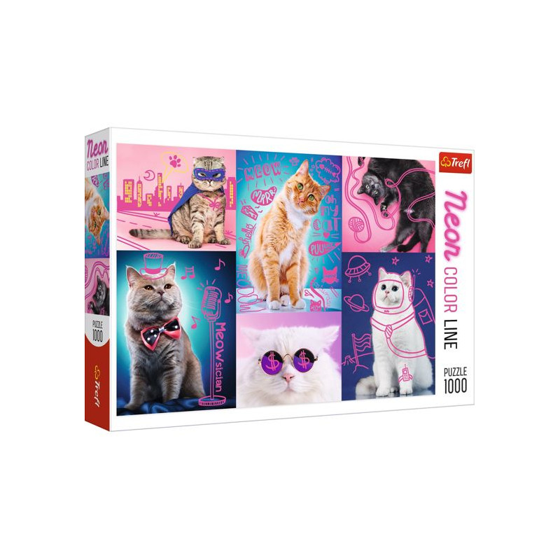 Puzzle Trefl 1000 elementów Super Kotki. Neon Color Line to seria produktów, która zaskakuje neonowymi kolorami i nowoczesnym designem. Po ułożeniu powstanie obrazek o wymiarach 683x480 mm.