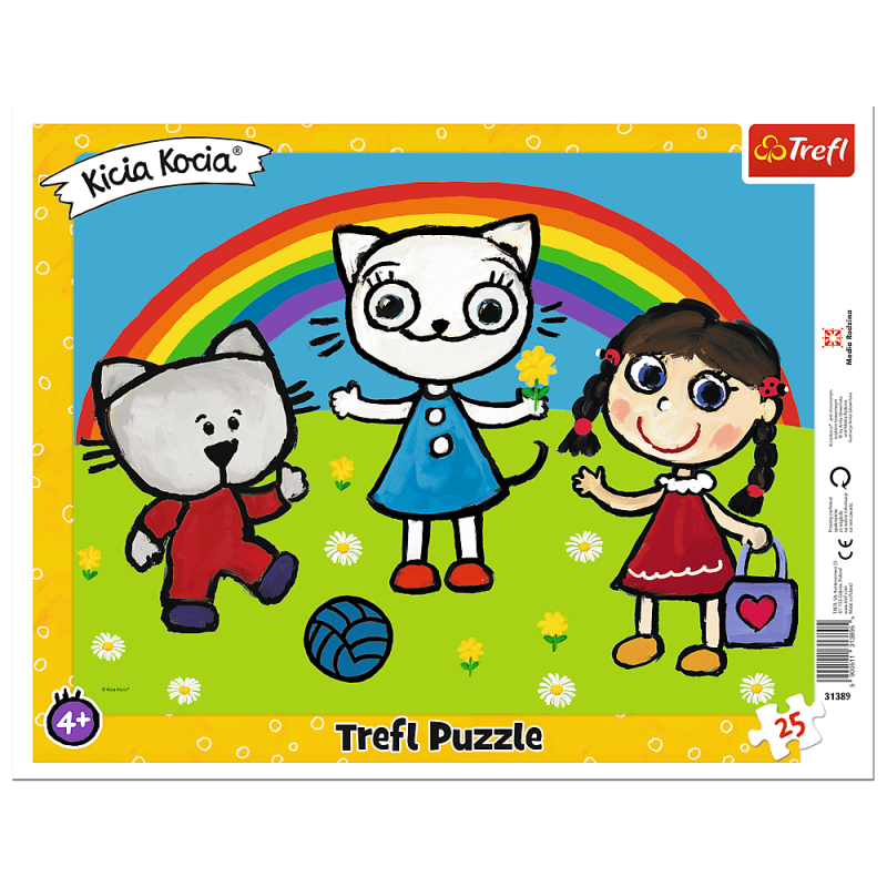 Puzzle stworzone z myślą o najmłodszych 25 elementów, obrazek z Kicią Kocią. Puzzle umieszczono w ozdobnej, spójnej graficznie ramce, tworzącej z obrazkiem bardzo ładną całość. Wyraziste kolory i prosty wzór są idealnie dostosowane do wieku i umiejętności dziecka. Układanie puzzli wpływa na rozwój koncentracji, spostrzegawczości, sprawności manualnej. Wiek 4+.