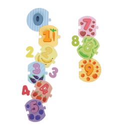 Cyferki z drewna z tekturowymi podkładkami z grubej, bezpiecznej tektury. Na każdym puzzlu znajduje się grafika z ilością warzyw lub owoców odpowiadająca danej cyferce. Ucz się jak napisać daną cyfrę – namalowane strzałki wskażą Ci kolejność oraz kierunek. Poznaj kolory i nazwij je
