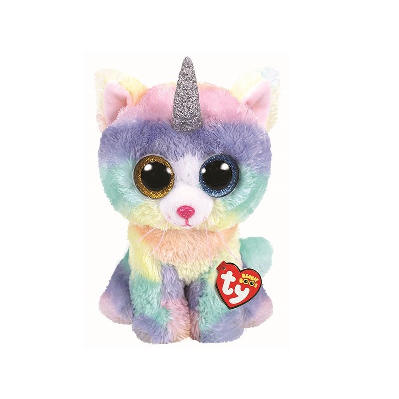 Pluszak Beanie Boss – kotek z rogiem. Zabawka wykonana z miękkiego pluszu o pięknych kolorach. Podstawa zabawki została wypełniona groszkami. Maskotka przyjemna w dotyku (dzięki miękkiemu materiałowi, który ją pokrywa). Zawiera podstawowe cechy charakterystyczne zwierzątka, jakie odwzorowuje. Posiada brokatowe tęczówki. Maskotka idealna do zabawy