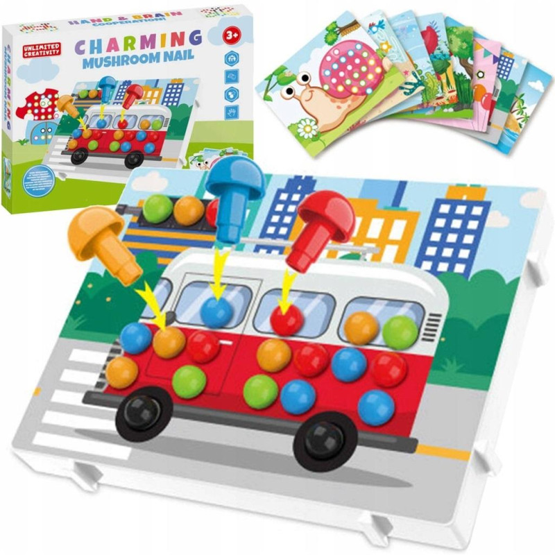 Zabawka rozwija kreatywność, kształtuje wyobraźnię a także rozwój zdolności manualnych. Wygodny plastikowy pojemnik do przechowywania guziczków.