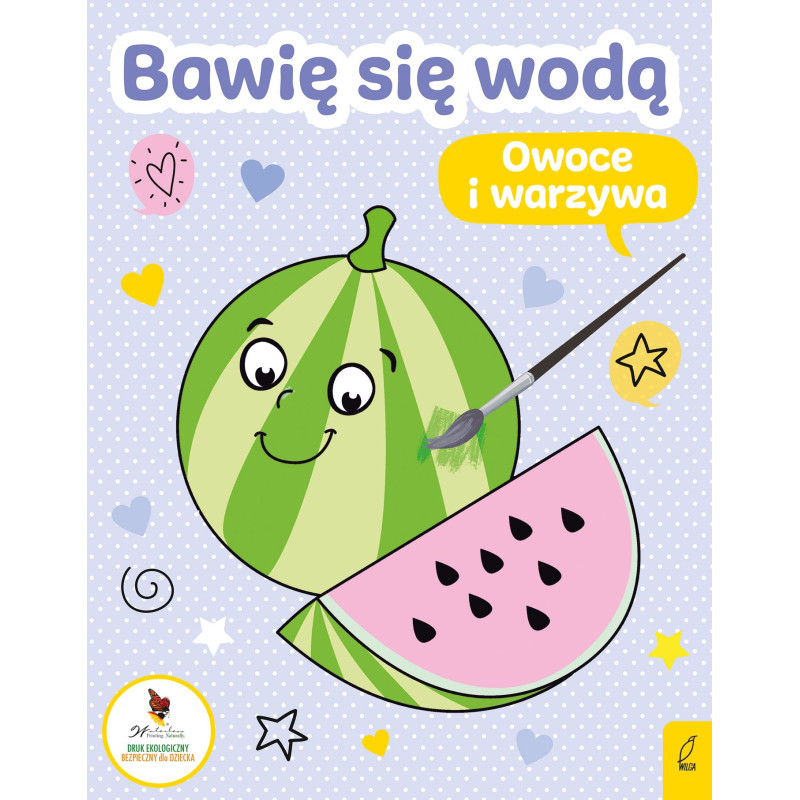 Bawię się wodą to seria magicznych, tematycznie podzielonych obrazków, do których kolorowania potrzebny będzie tylko pędzelek i woda! Świetna zabawa gwarantowana! Zeszyt zawiera najbardziej znane warzywa i owoce. Odczaruj owoce i warzywa, dodając ilustracjom odrobinę koloru! W książce znajduje się 12 ciekawych ilustracji, których kolory można odkrywać wyłącznie za pomocą pędzelka i wody. Czysta i wygodna zabawa dla dzieci uwielbiających malowanie!