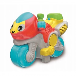 Super kolorowy motocykl jest również elektronicznym centrum aktywności, wspiera dziecko w nauce pierwszych liter i cyfr. Światło LED i wiele elementów mechanicznych i interaktywnych. Pobudza zdolności manualne, percepcję wzrokową i słuchu i pomaga rozwijać zrozumienie przyczyny i skutku.